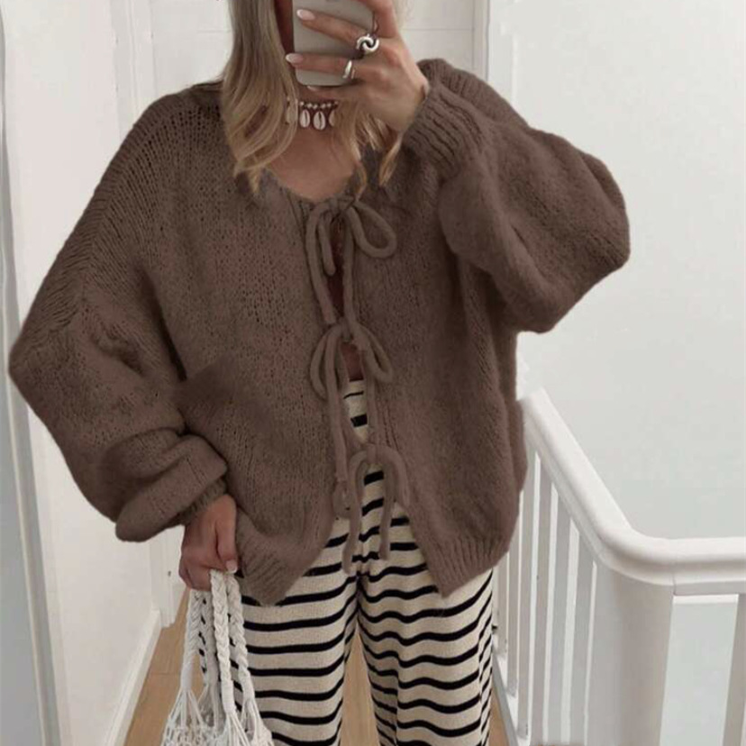 Bamby is jouw go-to knit voor een look die zowel charmant als gedurfd is. De opengewerkte striksluiting aan de voorkant voegt een verleidelijke twist toe aan de klassieke gebreide top, terwijl de licht gepofte mouwen en subtiele ruffle details zorgen voor een speels silhouet.