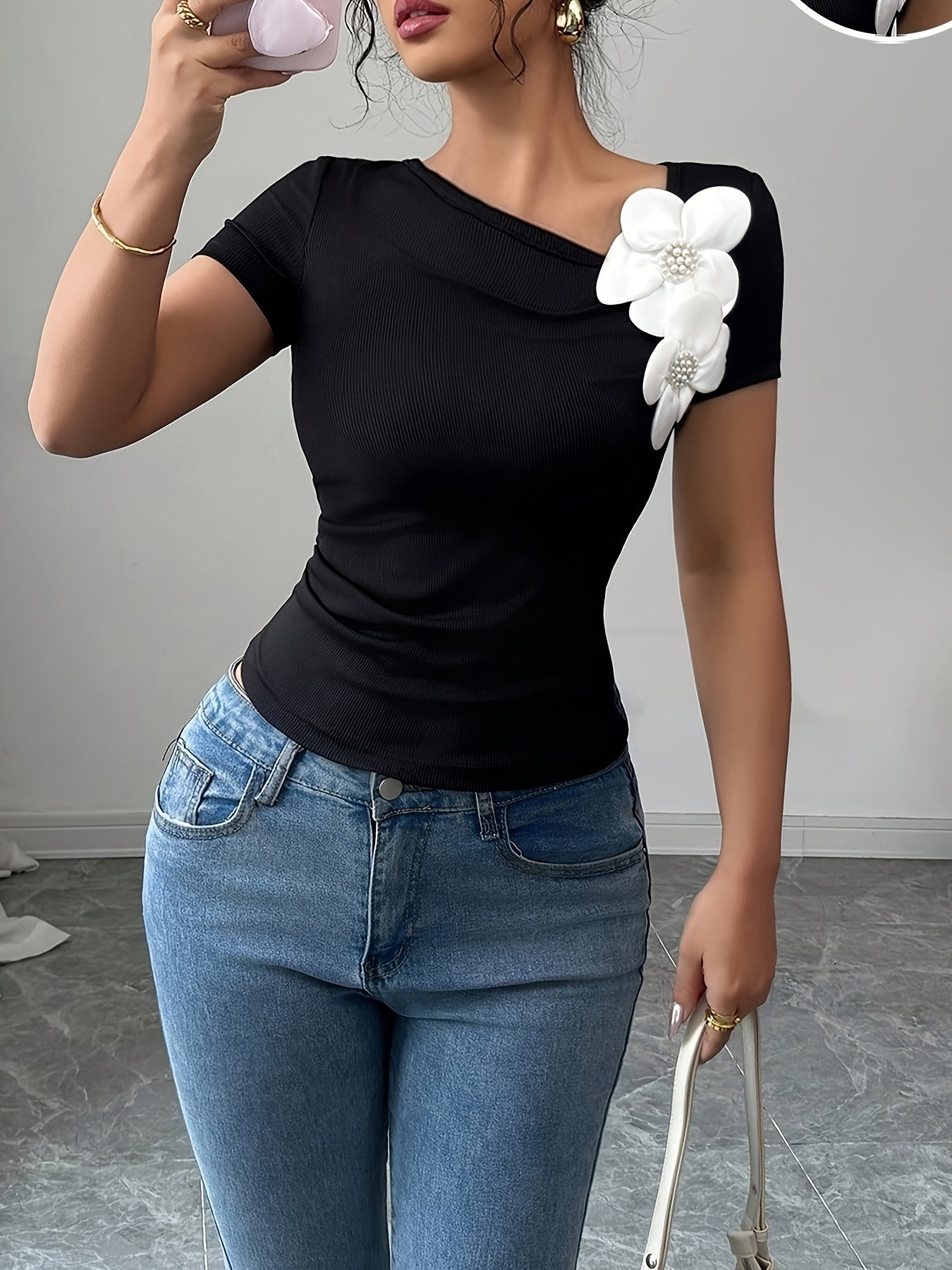 Geef je outfit een stijlvolle upgrade met de Briyana top. Deze nauwsluitende top met korte mouwen krijgt een opvallend detail dankzij de driedimensionale bloemenapplicaties op de schouder. Het ontwerp combineert eenvoud met verfijnde flair en is perfect voor elke gelegenheid waar je net dat beetje extra wilt uitstralen.