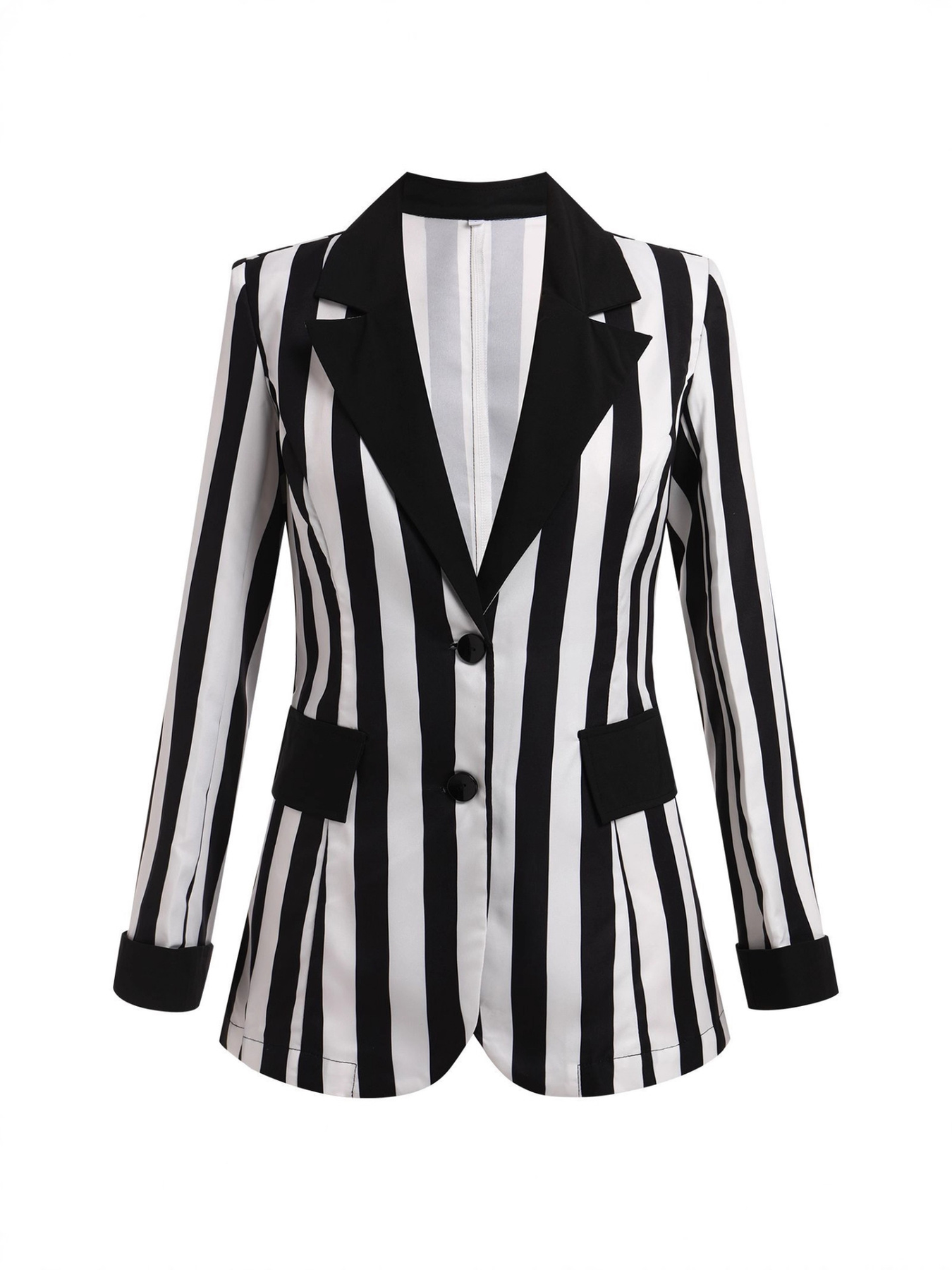 - Design: Zwart-wit gestreept patroon met contrasterende revers en praktische zakken