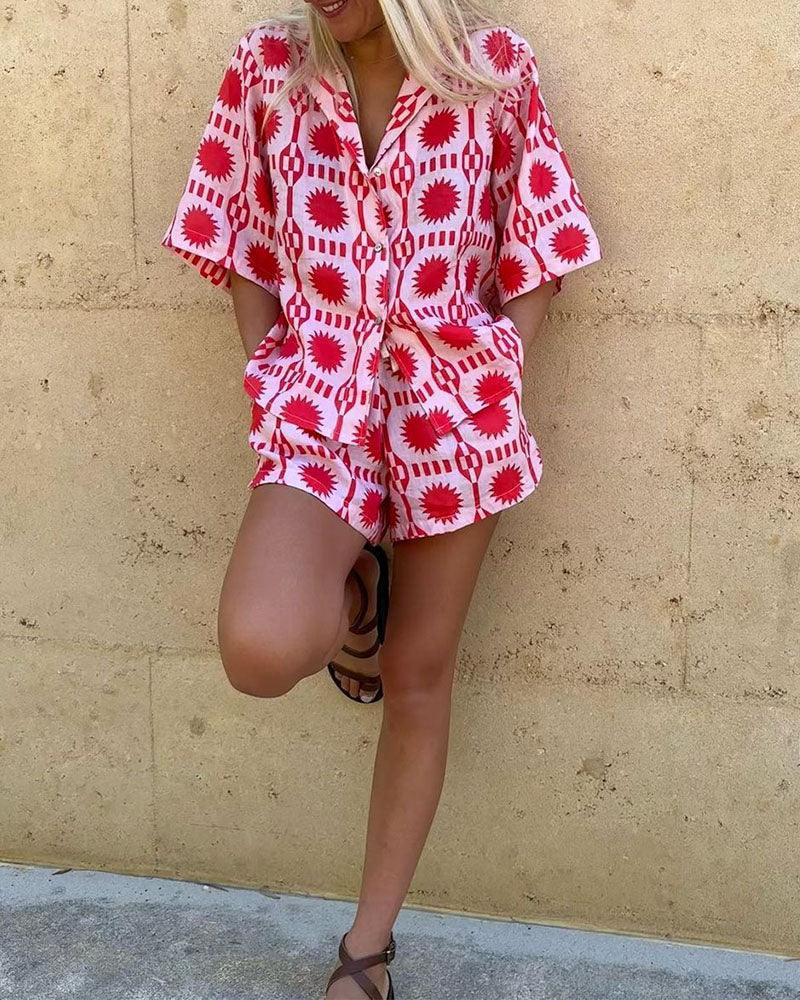 De Mimi Set is een vrolijke en luchtige co-ord die perfect is voor zonnige dagen. De combinatie van een losvallende button-up top en bijpassende shorts met opvallende grafische print zorgt voor een statement look vol karakter.
