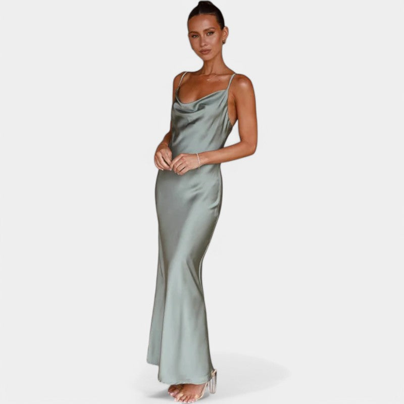 Deze satijnen maxi-jurk biedt de perfecte balans tussen verfijning en sensualiteit. Het glanzende materiaal en de gedrapeerde details creëren een luxe uitstraling, terwijl de open rug en de eenvoudige snit een moderne en elegante twist geven. Verkrijgbaar in warme tinten zoals brons en zacht groen, is deze jurk een must-have voor bruiloften, gala's of chique avonden.