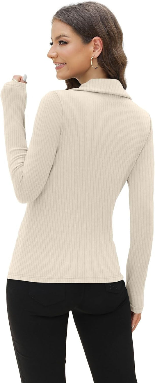 Dames Witte V-hals Poloshirt Ribgebreid met Stretch