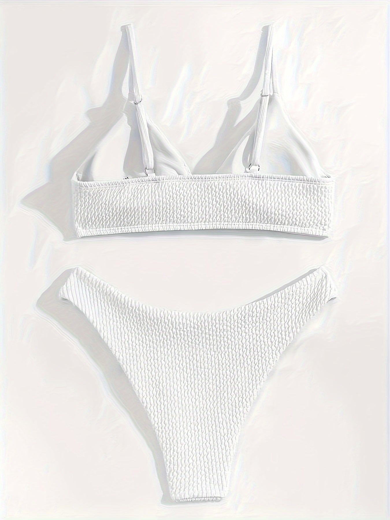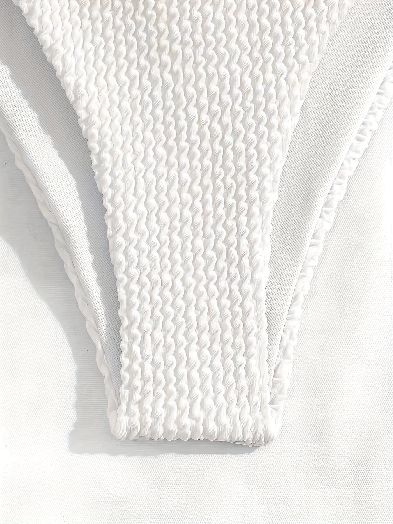 Dwuczęściowe bikini z wyrafinowaną strukturą wafla i zabawnymi majtkami z wysokim wycięciem. Top w kształcie trójkąta i minimalistyczne linie zapewniają elegancki, a jednocześnie wygodny krój — idealny na słoneczne dni i relaksujące chwile nad wodą.