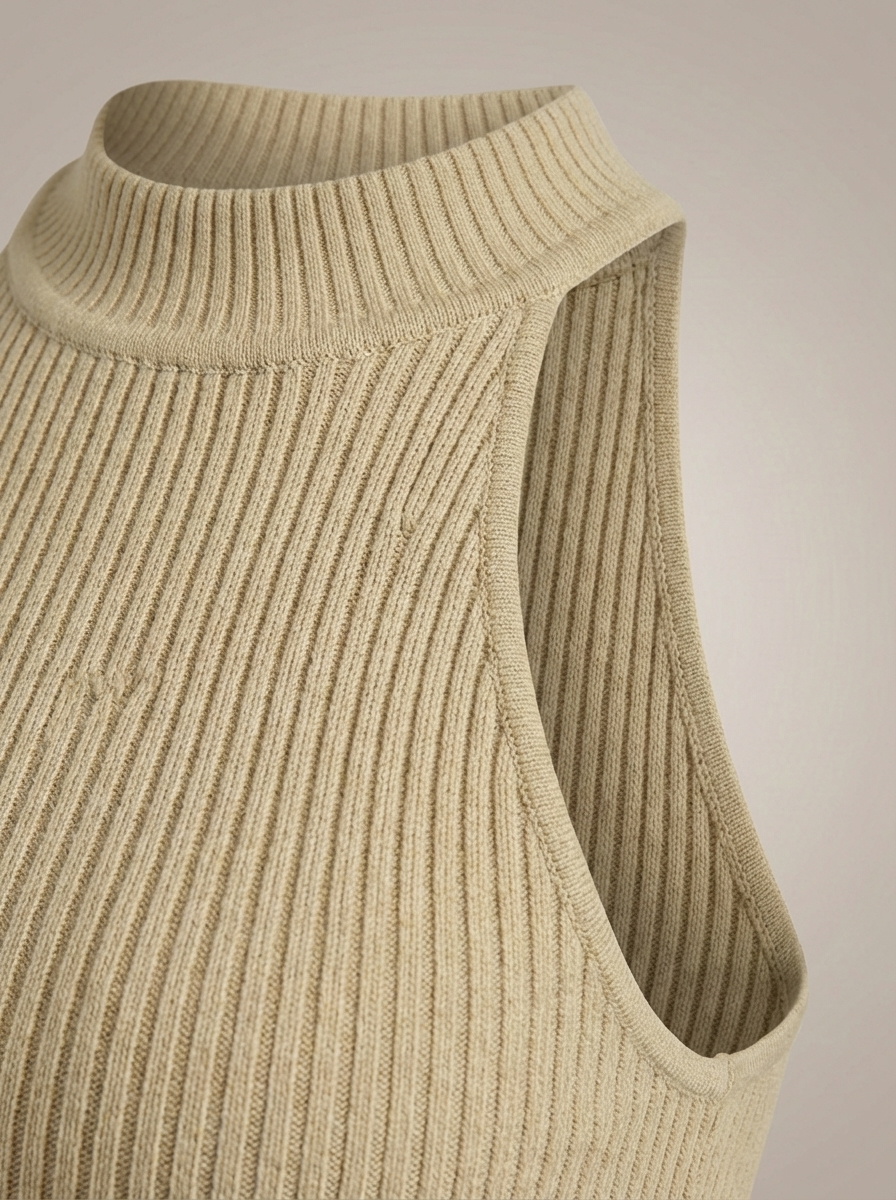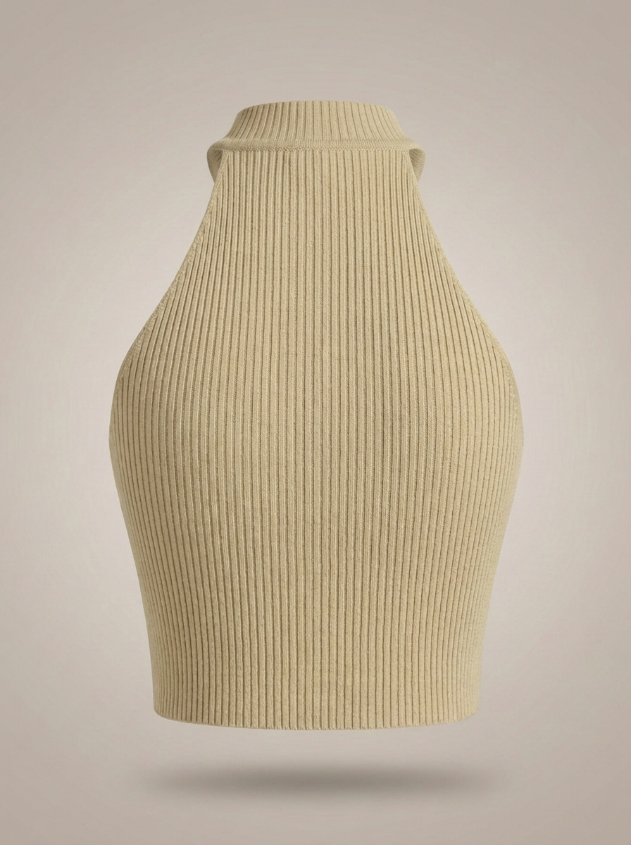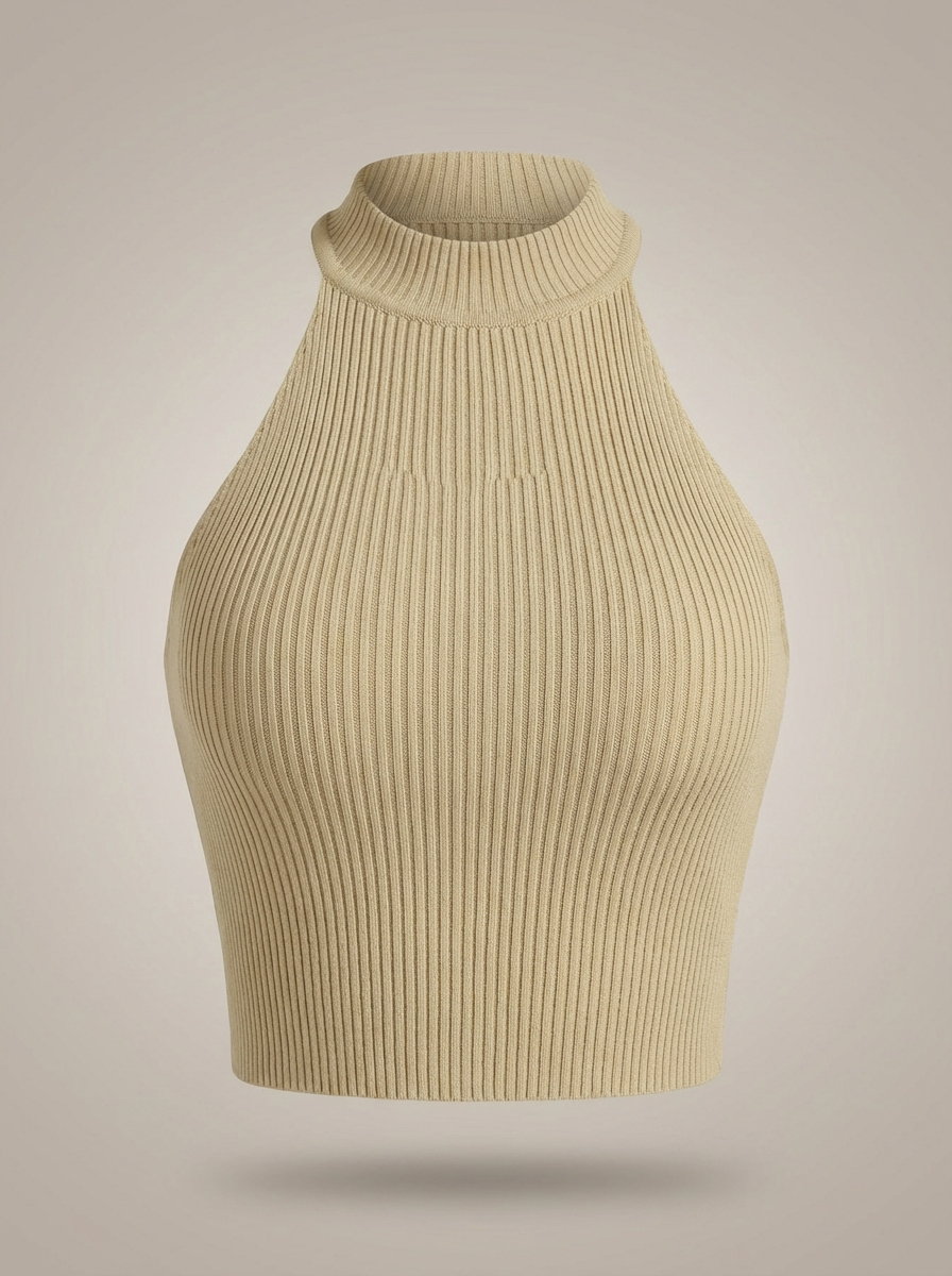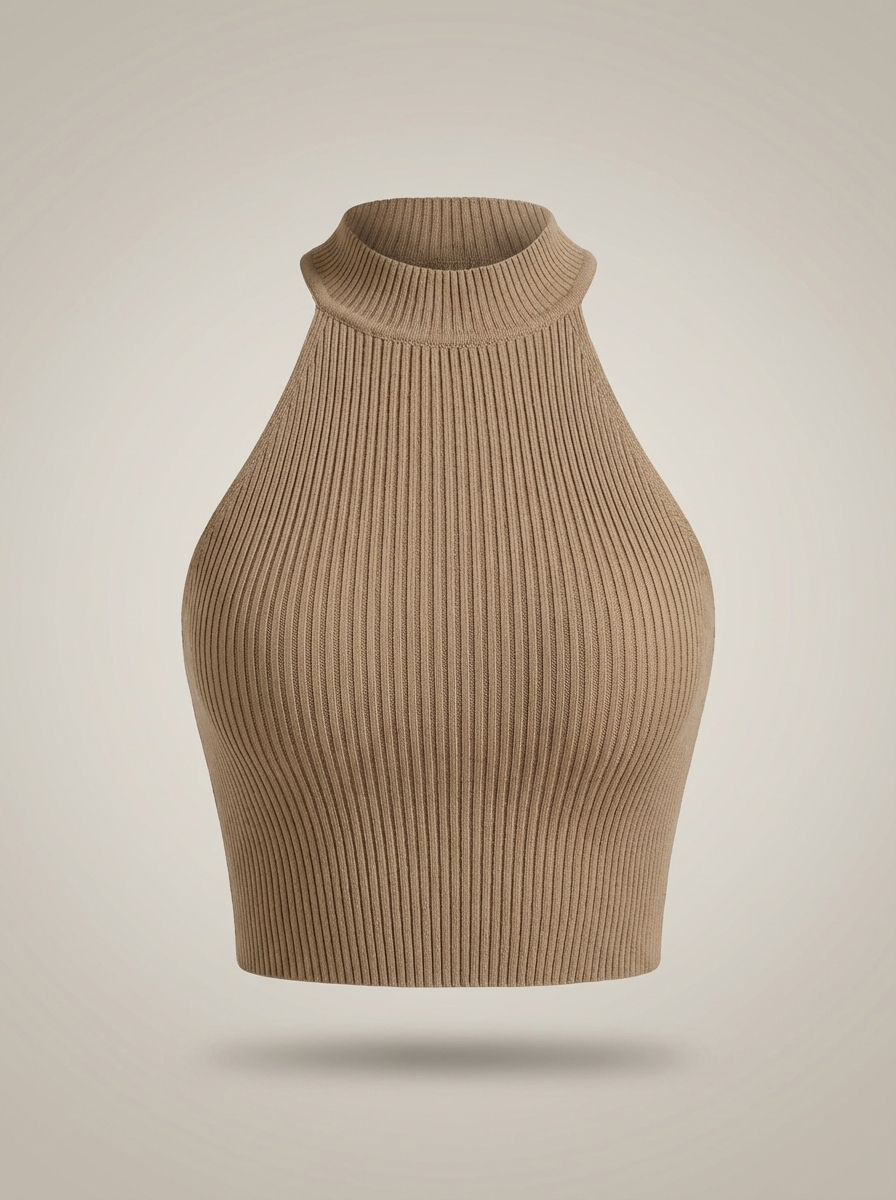 • Projekt: Wysoki kołnierz, krój na halter i prążkowany detal dla stylowego i wyrafinowanego wyglądu