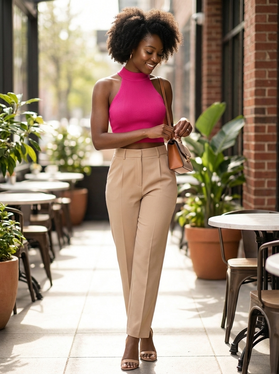 Ten stylowy damski krótki top na halter to nowoczesny wybór na letnie dni, miejskie stylizacje, wakacje i modne outfity. Wysoki kołnierz nadaje projektowi elegancki i wyrafinowany wygląd, podczas gdy krój na halter zapewnia kobiecy i korzystny efekt. Prążkowany detal dodaje głębi projektowi i nadaje topowi modnego, dopracowanego wykończenia. Dzięki krótkiej długości ten top łatwo łączy się z spodniami, spódnicami i szortami z wysokim stanem. Ten top na halter jest idealny dla kobiet, które chcą połączyć komfort z modnym i pewnym siebie wyglądem. Wszechstronny must-have dla tych, którzy cenią szykowny, nowoczesny i łatwy do stylizacji look.