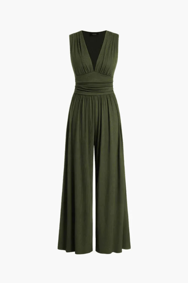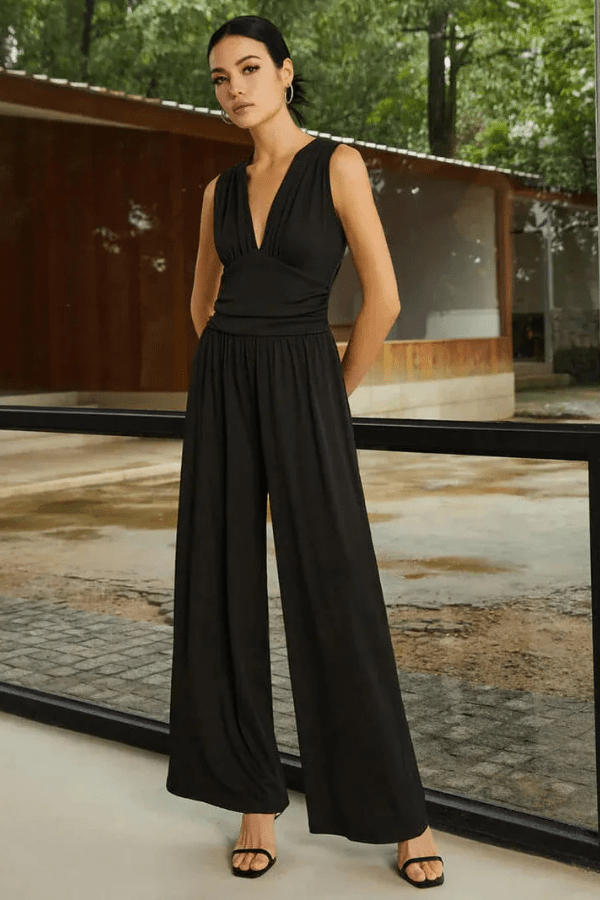Elegancki damski kombinezon z dekoltem w serek i szerokimi nogawkami