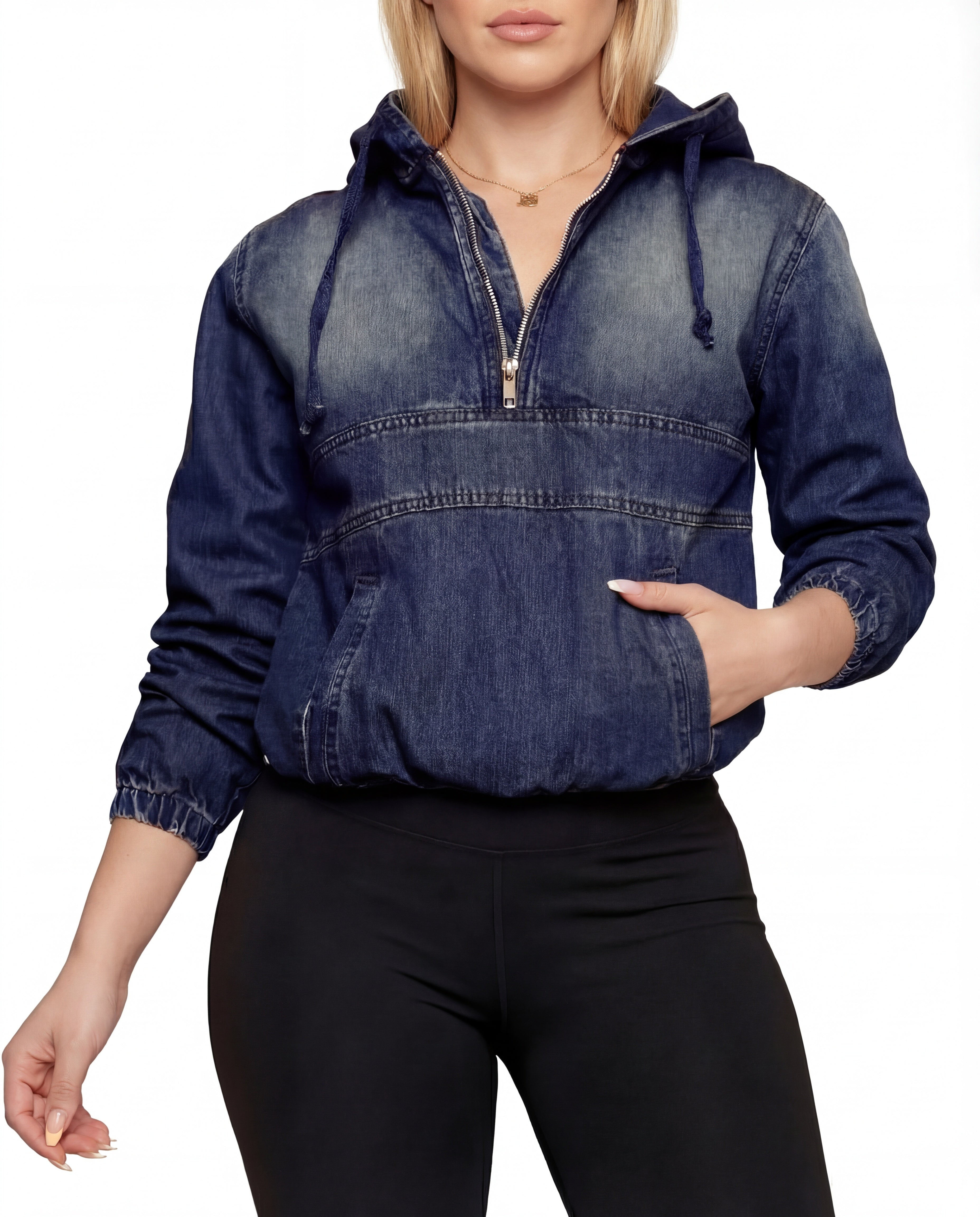 Deze casual dames denim hoodie combineert een stoere uitstraling met optimaal comfort. Het tijdloze ontwerp krijgt een moderne twist door de halve ritssluiting en de capuchon met trekkoord. De relaxte pasvorm zorgt voor een comfortabele fit, ideaal voor dagelijks gebruik. Perfect te combineren met een legging, jeans of sneakers voor een moeiteloze casual look.