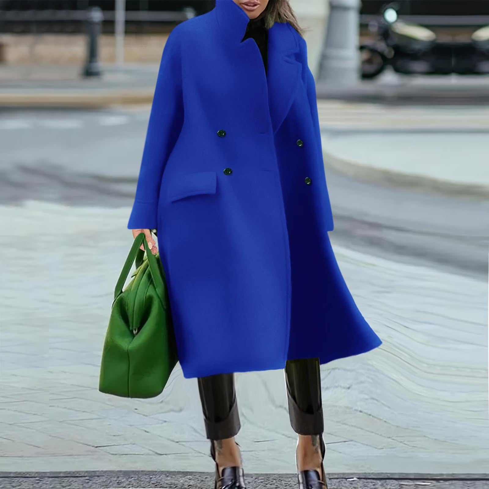 Deze lange mantel straalt pure elegantie en klasse uit. Het stijlvolle ontwerp met dubbele knopen en een hoge kraag geeft de jas een luxe uitstraling. Dankzij de lange pasvorm en tijdloze snit is dit een veelzijdig item dat je zowel zakelijk als casual kunt dragen. Een echte must-have voor een chique garderobe.