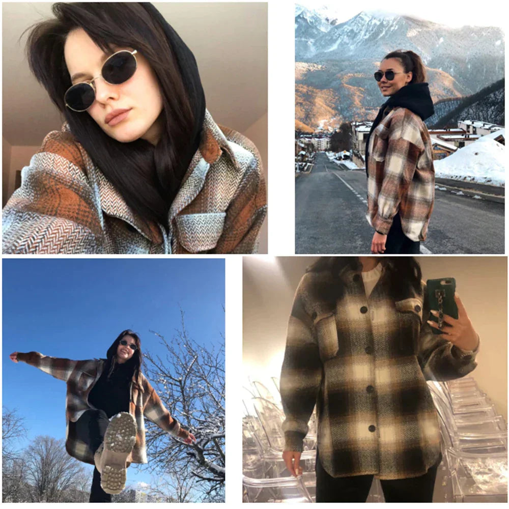 Deze trendy geruite dames jas combineert comfort en stijl in een moeiteloos draagbaar ontwerp. De losse pasvorm en praktische borstzakken geven een casual uitstraling, terwijl het geruite patroon zorgt voor een modieuze en tijdloze look. Perfect voor dagelijks gebruik en eenvoudig te combineren met verschillende outfits voor een eigentijdse streetstyle.