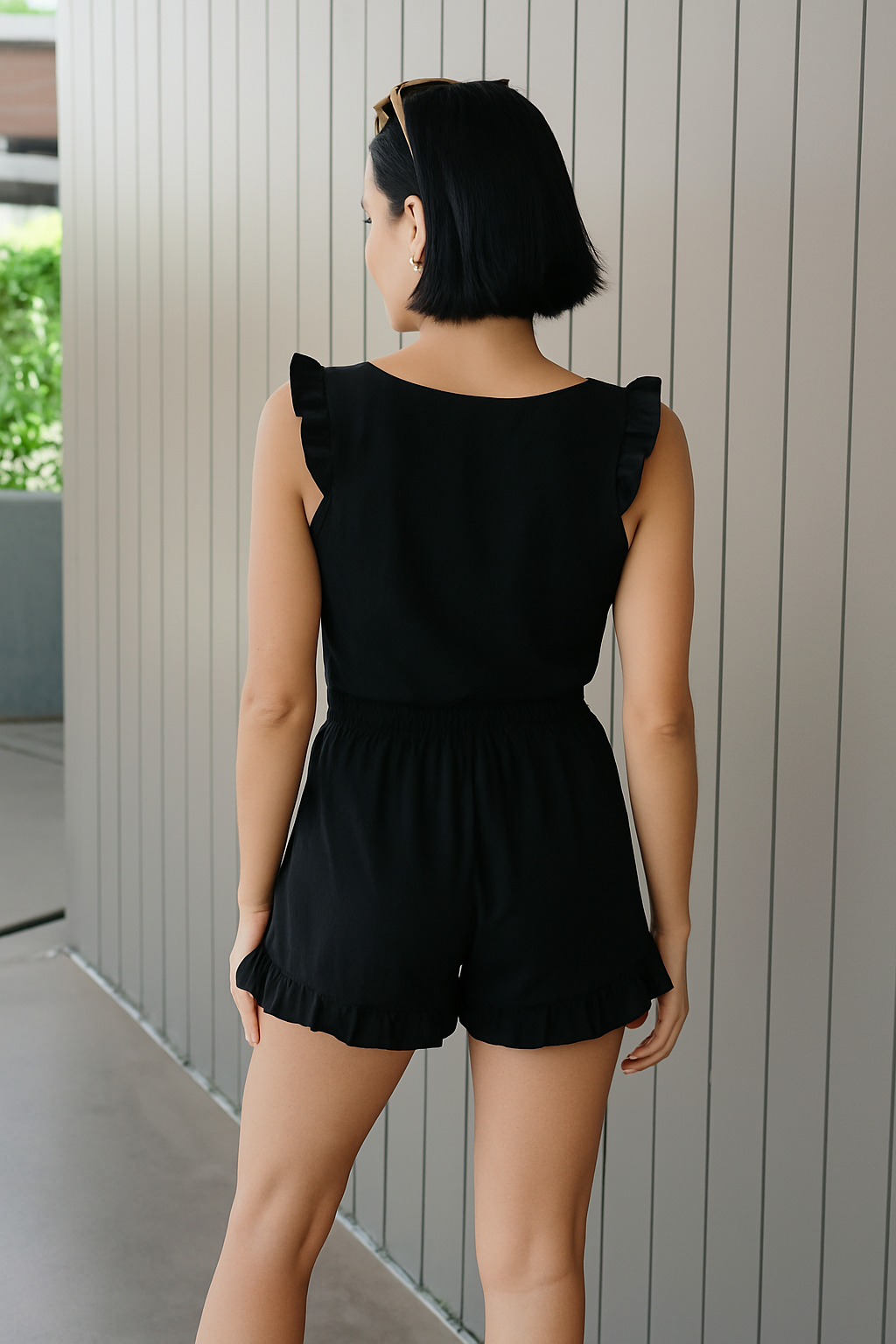 Deze luchtige en stijlvolle playsuit is perfect voor warme zomerdagen waarop je comfort en elegantie wilt combineren. De flatterende V-hals en subtiele ruches geven het ontwerp een vrouwelijke, speelse uitstraling, terwijl de elastische taille zorgt voor een mooie, natuurlijke pasvorm. De soepele stof beweegt licht mee, wat de playsuit ideaal maakt voor strandwandelingen, vakanties of casual citylooks. Een veelzijdige zomerfavoriet die moeiteloos chic oogt.